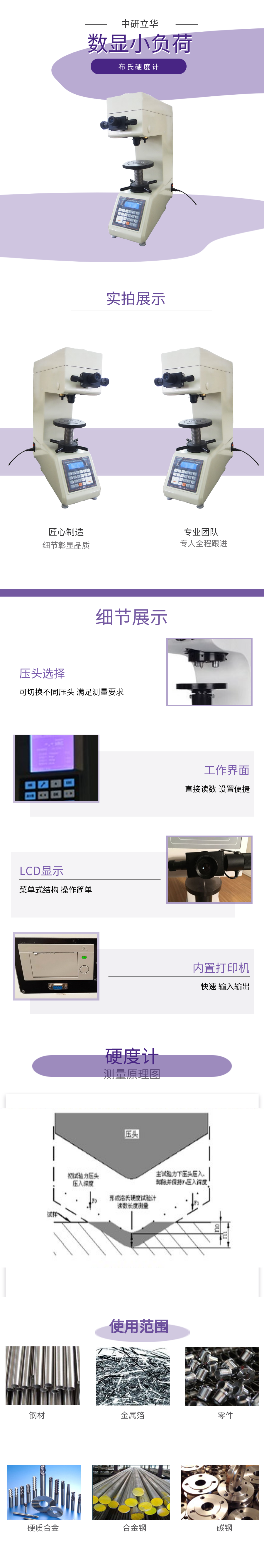 用途:適用于具有大晶粒金屬材料的硬度測定。如鑄鐵、有色金屬及其合金、各種退火調(diào)質(zhì)處理后以及大多數(shù)出廠供貨的鋼材等。特別適用較軟的金屬,如純鋁、銅、鉛、錫、鋅等及其合金。